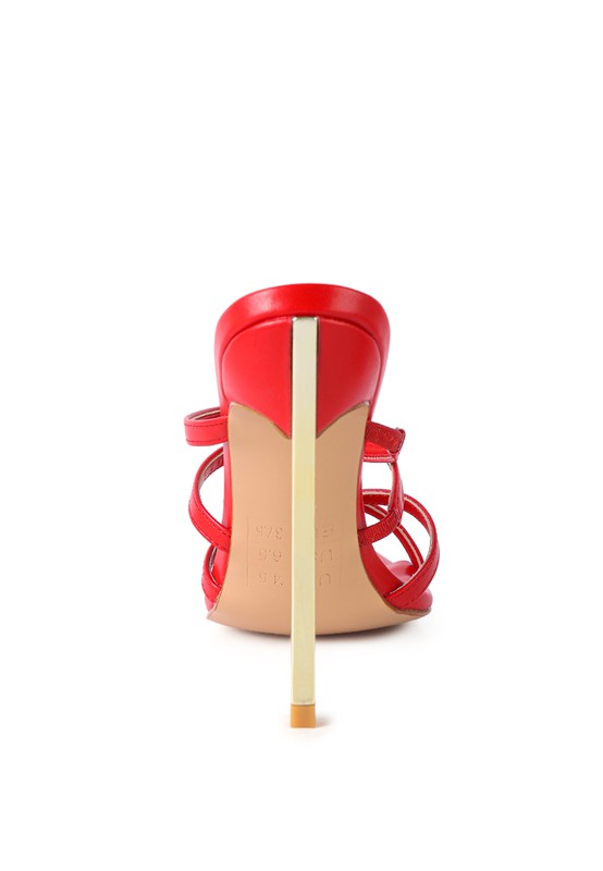 Be the Femme Fatale everyone envies in these high heeled sandals with snake print details. The pointed toe sandal's strappy design is all in vogue, the metallic heel highlights only adds the much needed drama.